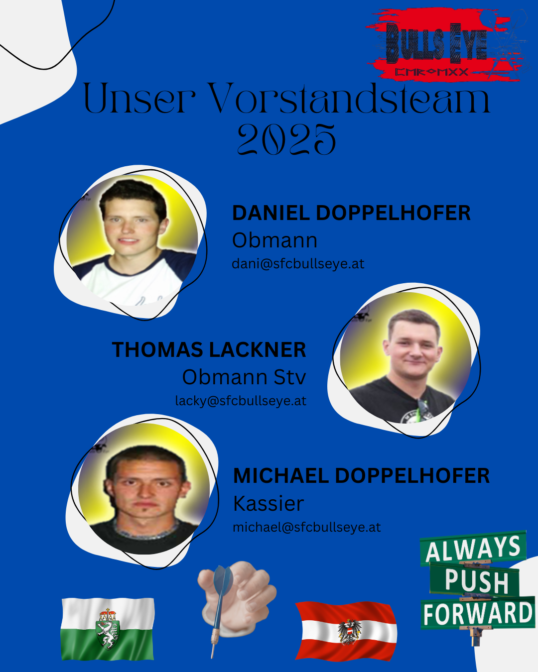 Der SFC Bulls Eye 2011 wird von Obmann und Mitbegründer Daniel Doppelhofer und zwei weiteren Vorstandsmitgliedern geleitet. Bei Fragen rund um den Verein sind die Vorstandsmitglieder die ersten Ansprechpartner. Wir verweisen auch auf unsere KONTAKT-Seite.